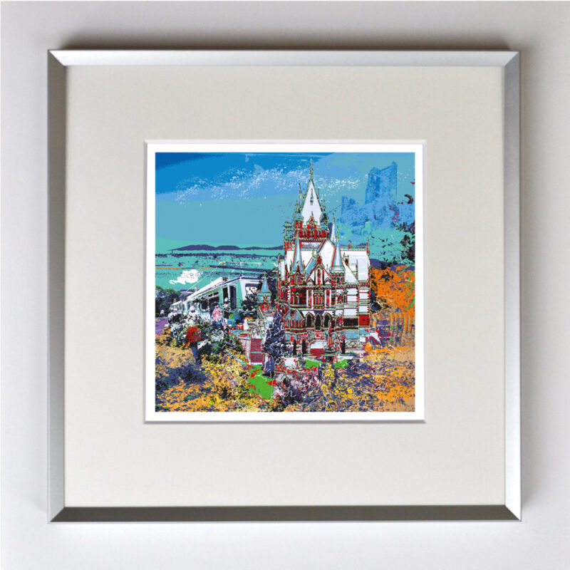Siebengebirge mit Drachenfels, Drachenburg und Zahnradbahn, gerahmt mit Passepartout, Bildmaß 14 x 14 cm, Rahmenmaß 22 x 22 cm, € 25,00