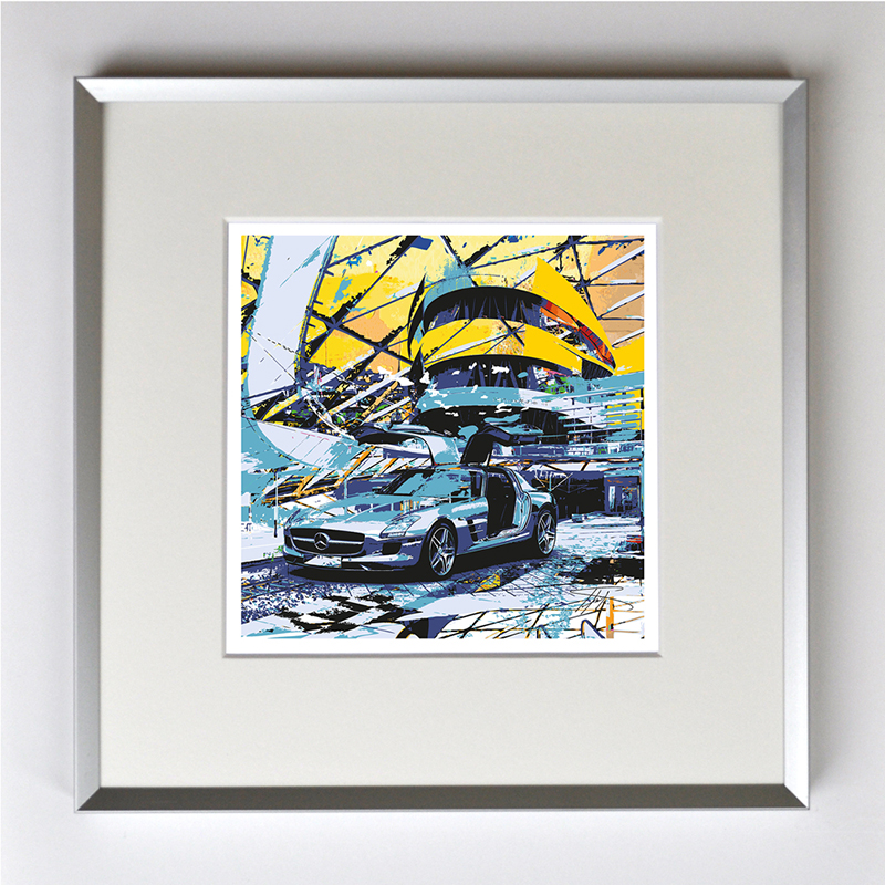Mercedes SLS AMG, gerahmt mit Passepartout, Bildmaß 14 x 14 cm, Rahmenmaß 22 x 22 cm, € 25,00