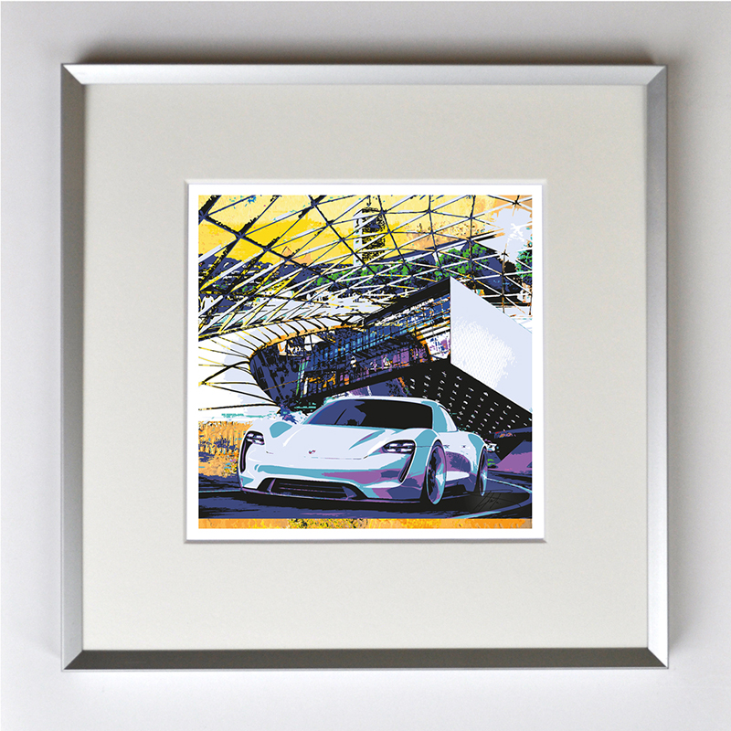 Porsche Taycan, gerahmt mit Passepartout, Bildmaß 14 x 14 cm, Rahmenmaß 22 x 22 cm, € 25,00