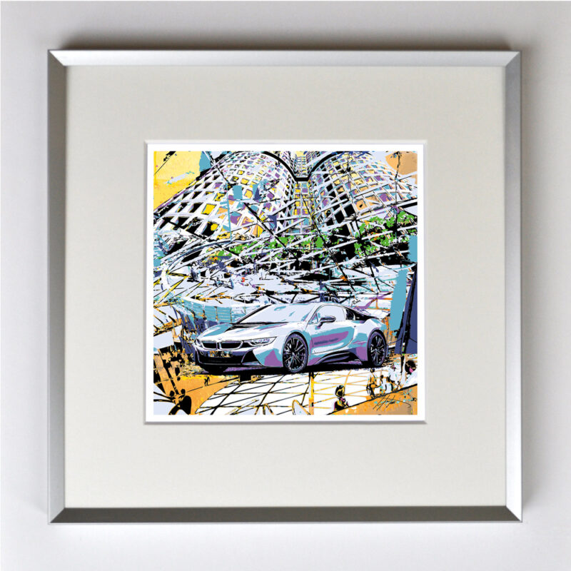 BMW i8, gerahmt mit Passepartout, Bildmaß 14 x 14 cm, Rahmenmaß 22 x 22 cm, € 25,00