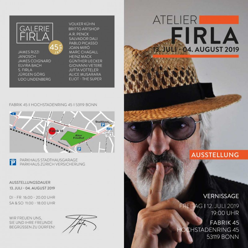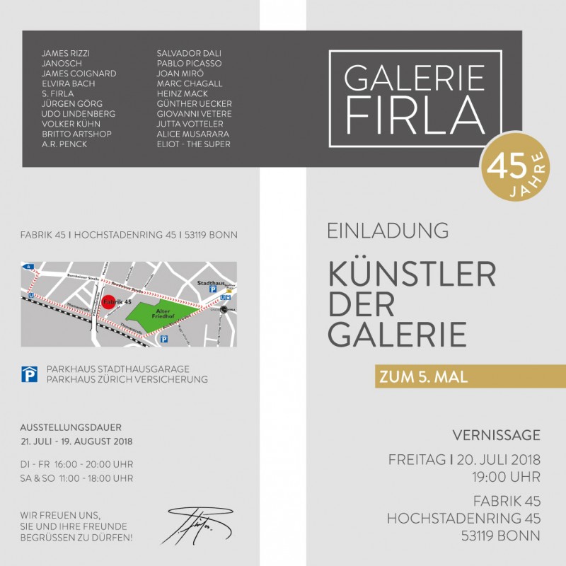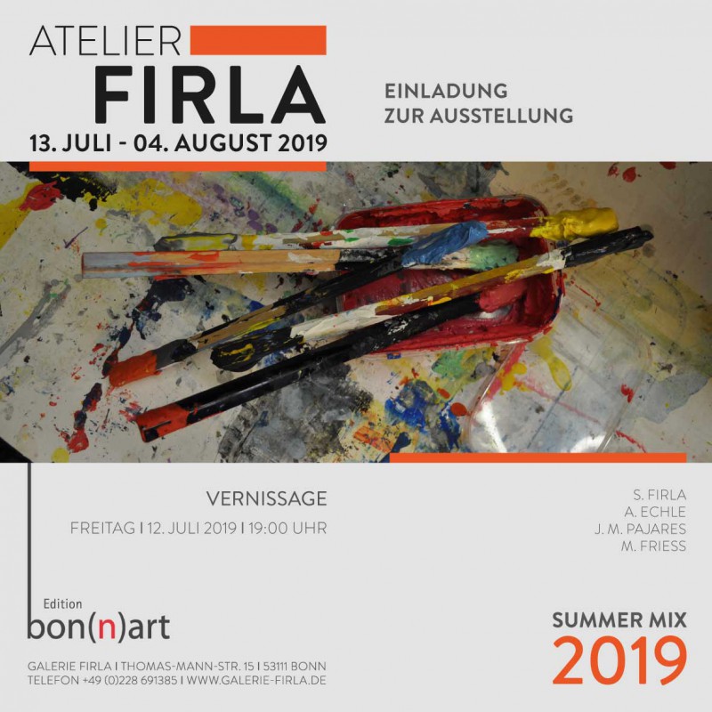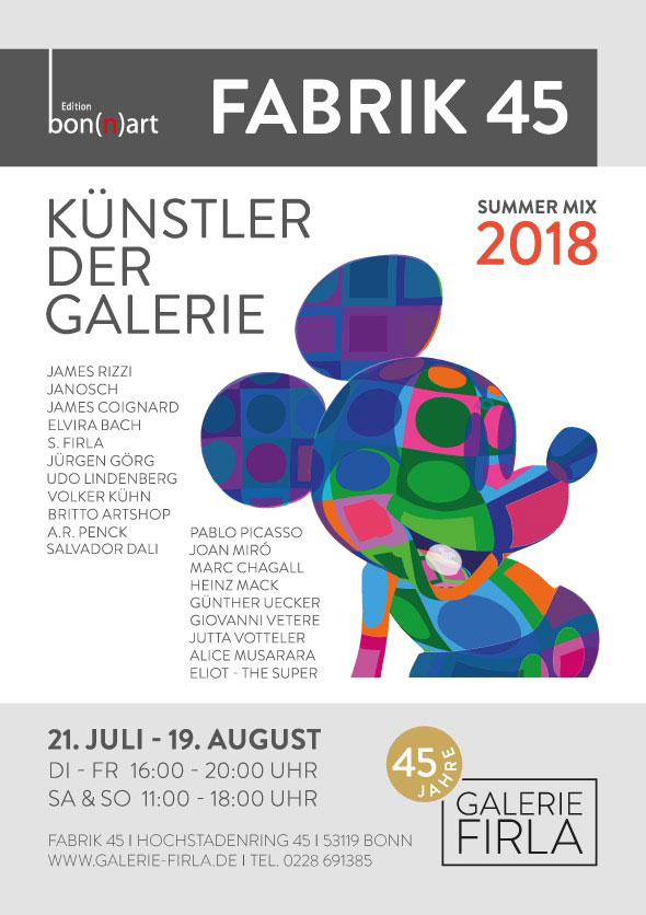 Einladung zur Sommerausstellung "Summer Mix 2018" - Künstler der Galerie Firla - in der Fabrik 45 in Bon