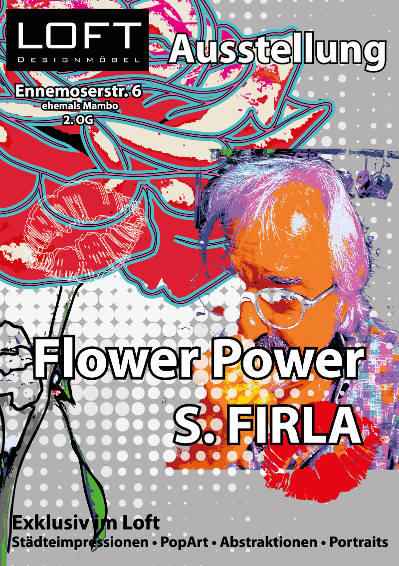 Ausstellung Flower Power im Loft, Ennemoserstr. 6 in Bonn. Auf 1000 m2 neben einer grossen Auswahl an Bildern zum Thema Blumen, auch Abstraktionen, Musiker und Städteimpressionen