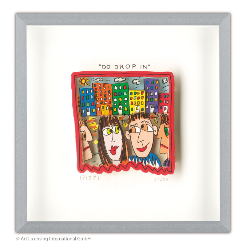Do Drop In, 3-D Grafik von James Rizzi, 15,5 x 15,5 cm mit Aufsteller, Auflage 350, nummeriert und drucksigniert, Preis auf Anfrage