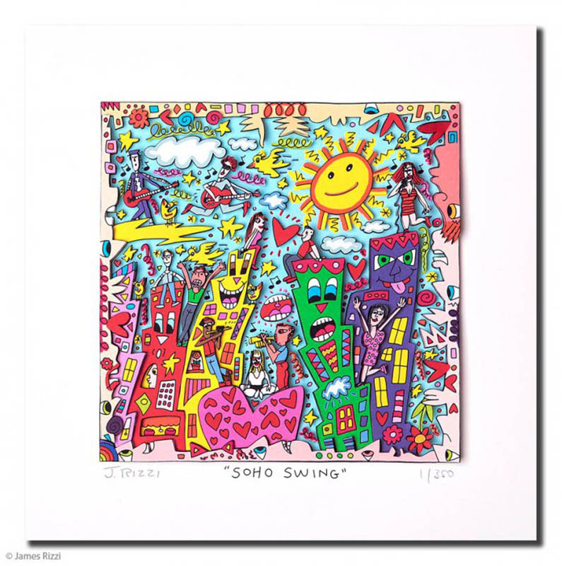 Soho Swings von James Rizzi Original 3D-Grafik aus der 4er-Serie NYC-Music aus dem Jahr 2013 stempelsigniert und nummeriert Größe 45 x 45 cm, nur im Vierersatz erhältlich