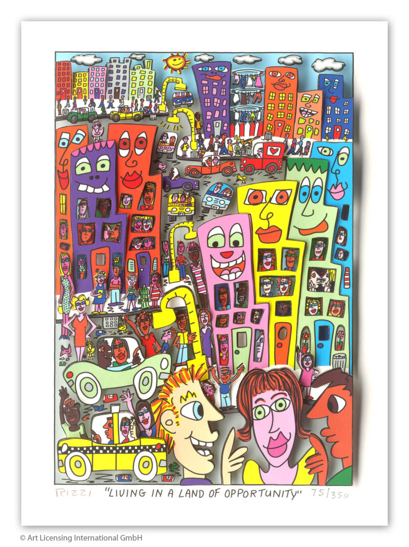 Living in a Land of Opportunity, 3-D Grafik von James Rizzi, 30 x 40 cm, Auflage 350, nummeriert und drucksigniert, Preis auf Anfrage