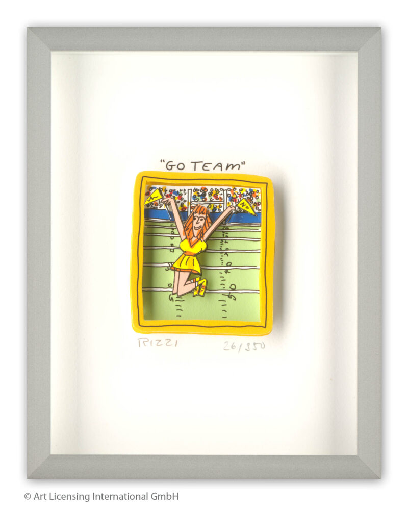 Go Team, 3-D Grafik von James Rizzi, 15,5 x 15,5 cm mit Aufsteller, Auflage 350 Exemplare, drucksigniert und nummeriert, Preis auf Anfrage