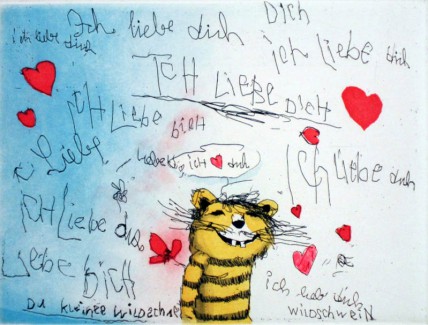 Janosch Original Farbradierung bei der Galerie Firla in Bonn Ich liebe Dich, ich liebe Dich …Motiv 19,5 x 15 cm, leider vergriffen