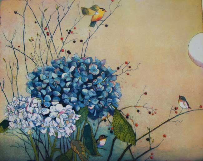 Original Farbradierung, Im Hortensiengarten, nummeriert und handsigniert, Blattgröße 63 x 75 cm, Motivgröße 47 x 60 cm