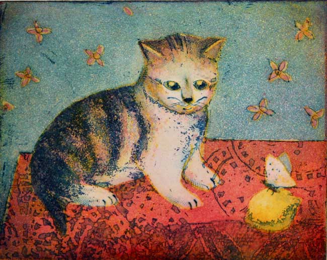 Original Farbradierung, Junges Kätzchen, nummeriert und handsigniert, Blattgröße 24 x 30 cm, Motivgröße 12 x 15 cm
