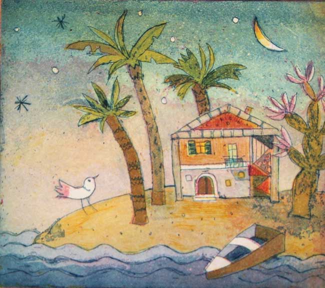 Original Farbradierung, Kleines Paradies, nummeriert und handsigniert, Blattgröße 24 x 30 cm, Motivgröße 12 x 13,5 cm