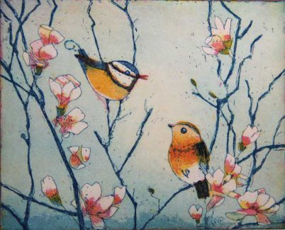 Original Farbradierung, Gartengeplauder, nummeriert und handsigniert, Blattgröße 24 x 30 cm, Motivgröße 12 x 15 cm
