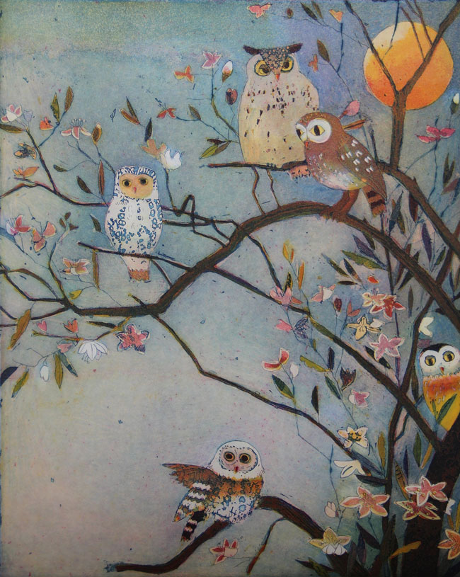 Original Farbradierung, Eulenquintett, nummeriert und handsigniert, Blattgröße 50 x 60 cm, Motivgröße 30 x 38 cm, vergriffen