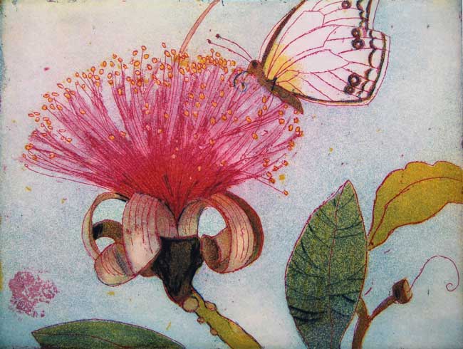 Jutta Votteler, Naschender Schmetterling, Original Farbradierung, Blattgröße 30 x 40 cm, Motivgröße 15 x 20 cm, nummeriert und handsigniert