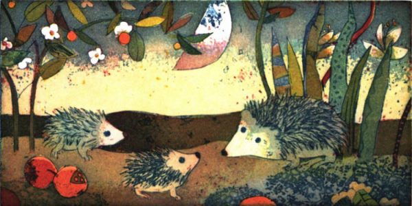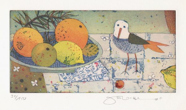 Obstbesuch, Original Farbradierung, nummeriert und handsigniert, Blattgröße 20 x 30 cm, Motivgröße 10 x 20 cm