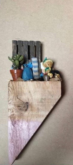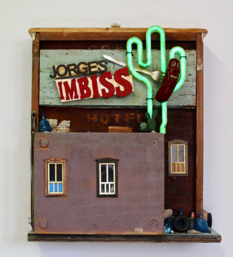 Jorges Imbiss, Holzskulptur, LED batteriebetrieben und USB Anschluß, 54,5 x 45 x 15,5 cm, Preis auf Anfrage