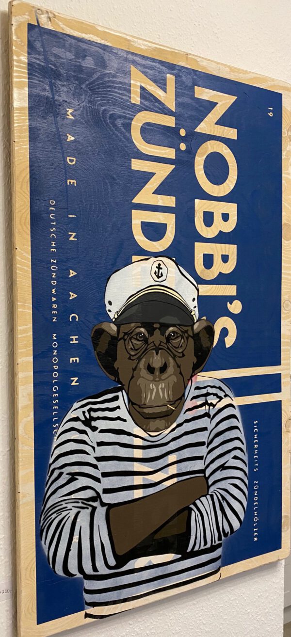Käpten Nobbi mit Zündhölzern auf Holzplatte, Unikat, 14 Schablonen, Sprühlack, gesiegelt und unterschrieben, verkauft