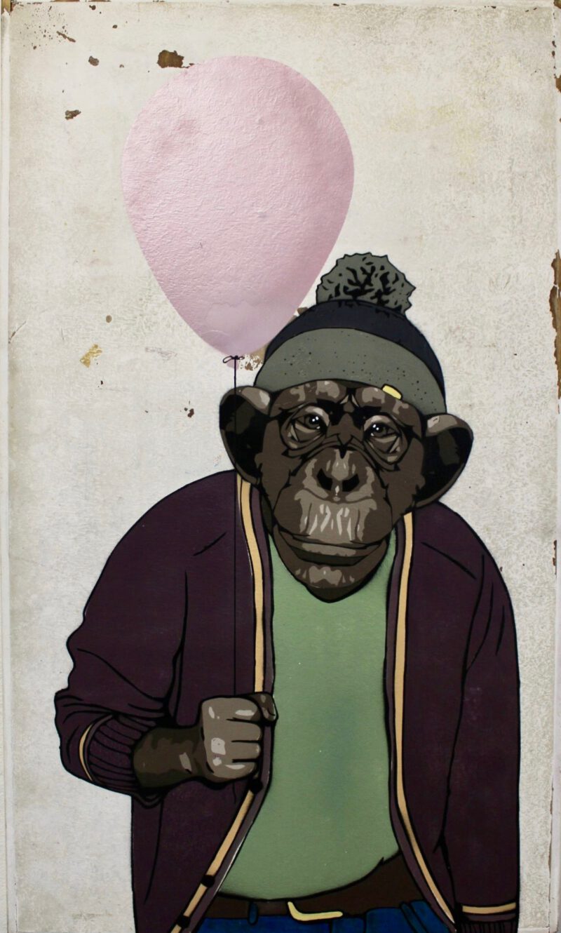 Nobbi mit Balloon, Holzplatte, 14 Schablonen, Sprühlack, Acryl, 120 x 71,5 x 3,5 cm, vergriffen!
