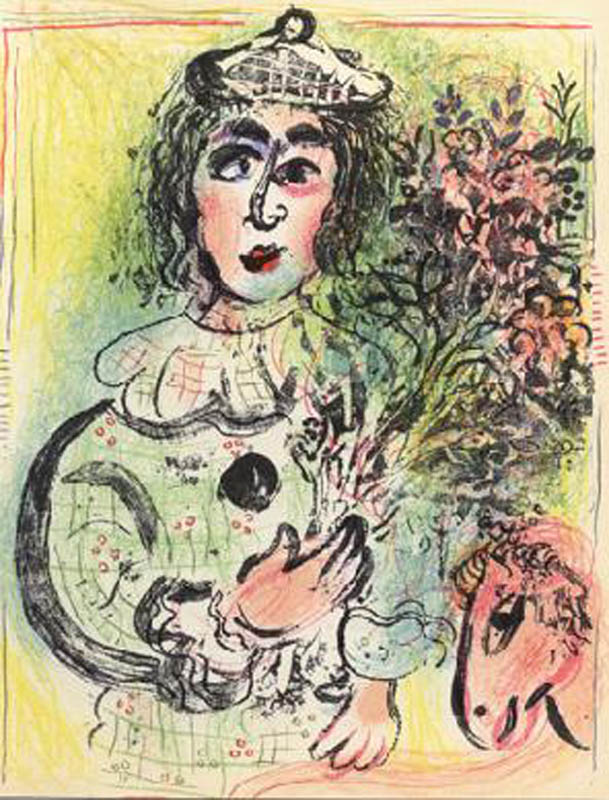 Clown mit Blumen / Original Farblithografie, Bildgröße 32x24 cm, Mourlot 399, 1963, Lithograph II