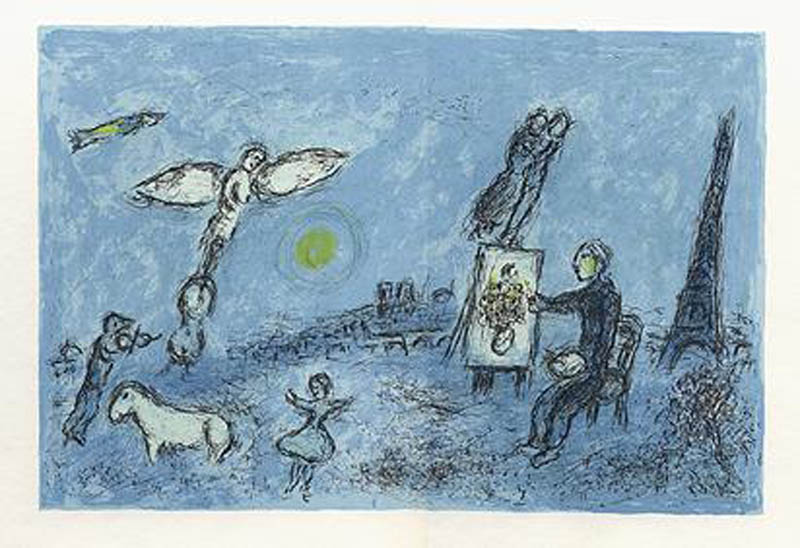 Der Maler vor dem Dorf I / Original Farblithographie, 1969, Mourlot 603, Motiv 38x28 cm