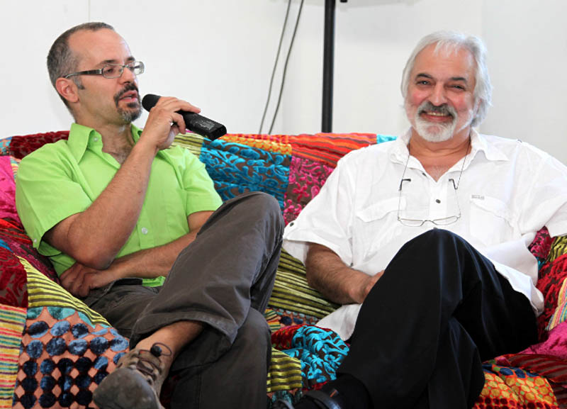 Galerist S. Firla im Gespräch mit dem Künstler Patrick Preller am Abend der Vernissage der Galerie Firla aus Bonn
