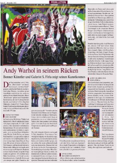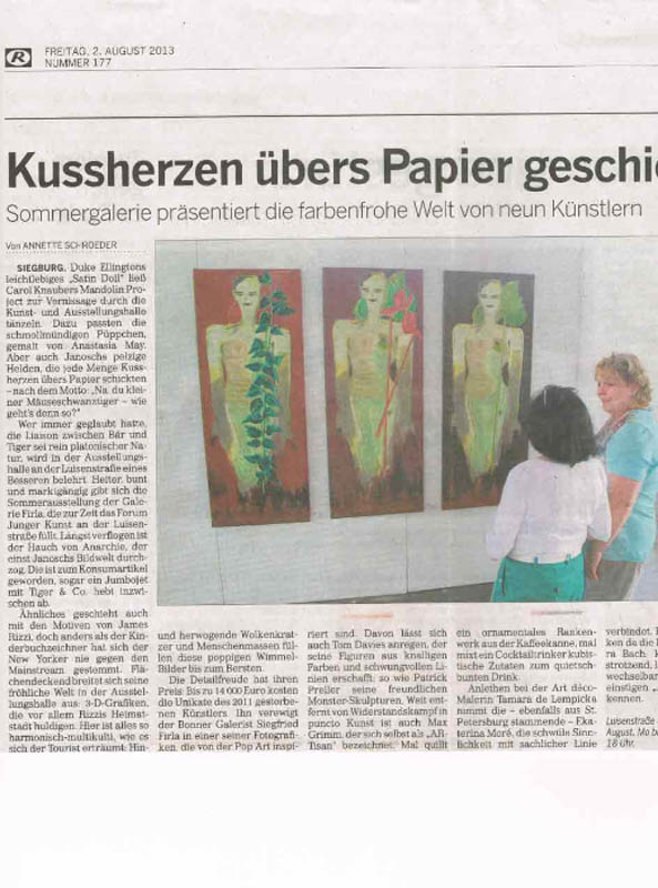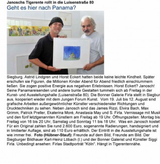 Pressebericht in der Bonner Rundschau über die Ausstellung der Galerie Firla aus Bonn in Siegburg mit Janosch, James Rizzi, Ekaterina More,, Anastasia May, Patrick Preller, Tim Davis, Max Grimm, Elvira Bach und S. Firla