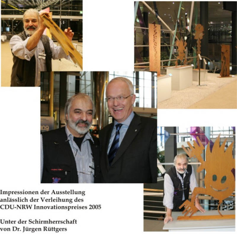 Galerist und Künstler S. Firla mit Jürgen Rüttgers in alten Plenarsaal in Bonn anlässlich einer Ausstellung seiner Skulpturen