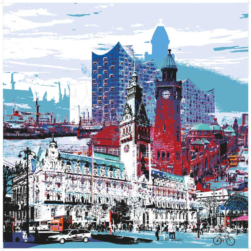 Hamburger Impressionen, Rathaus, Elphi , Hafen und Michel, Alu-Dibond mit Lack gehöht, 100 x 100 cm, Auflage 30, nummeriert und handsigniert, Preis auf Anfrage