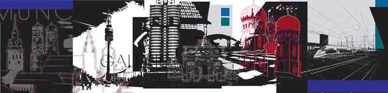 Münchner Impressionen mit der Frauenkirche, dem Olympiapark, dem Siegestor, dem ICE und der BMW Zentrale Alu-Dibond mit Lack gehöht, 43 x 110 cm, nummeriert und handsigniert Katalog Nr. 09_533