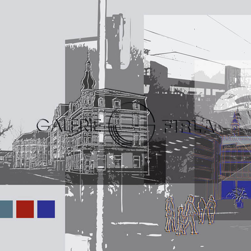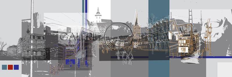 Siegburger Impressionen mit dem Kreishaus, dem Hotel Felder, dem Europaplatz und dem ICE Bahnhof Serigraphie(Mischtechnik) auf Bütenpapier, Bildgröße 25x25cm und 60x60cm, Auflage 50 Exemplare handsigniert und nummeriert, 5 Exemplare auf Alu-Dibond (Metallplatte gebürstet) Katalog NR 10674